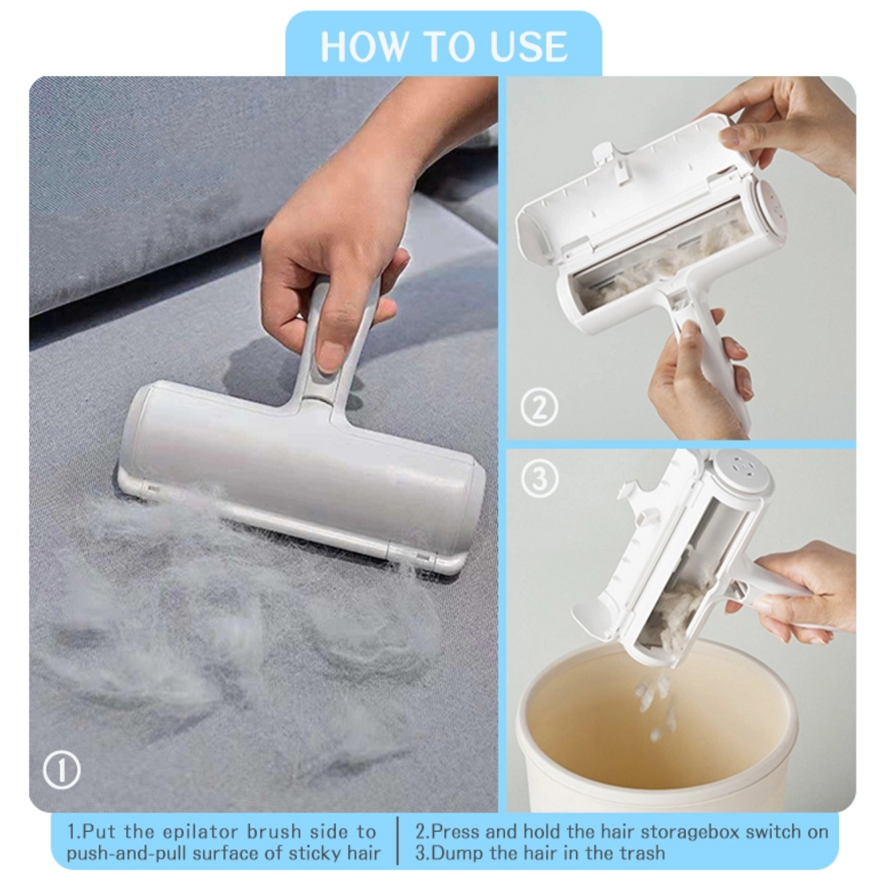رولر لتنظيف الشعر بسهولة وبدون بطاريات , طريقة الاستعمال : يتم تمرير الرولر فوق الشعر ذهاباً و إياباً ثم يتم قلب الرولر وتحريك الوجه للأعلى والأسفل حتى يدخل الشعر بالرولر ومن ثم يتم إعادة العملية في حال تبقى شيء , يمتاز بإمكانية غسلة و إعادة استخدامة. يمكن استعمالة على الكنب والطاولة أو الملابس. لا مزيد من الشعر المتطاير على الأشياء بعد اليوم!