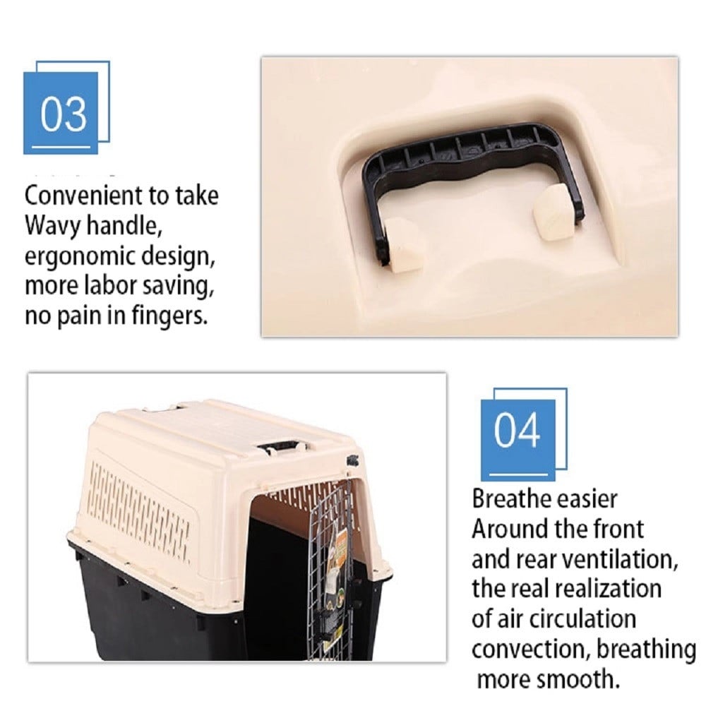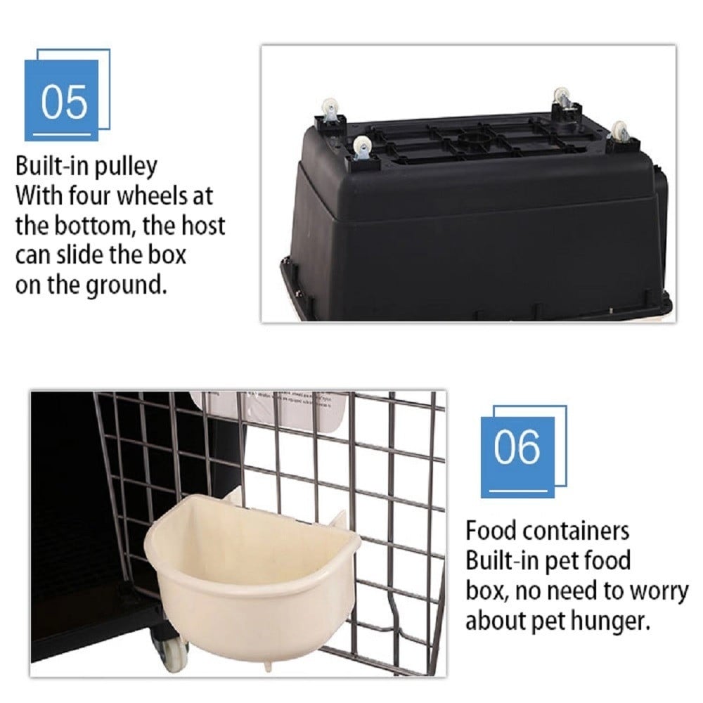 قفص ضخم لتنقل الكلاب او للسفر بطول المتر و10 سانتيات يأتي مع صحن يعلق بالداخل للأكل او للشرب ويمتاز بكفرات تدور بجميع الاتجاهات 360 درجة لتسهل لك عملية تحريكه ومقبضين لليد مع فَرشة بلاستك داخل القفص لتمنع انزلاق حيوانك الأليف ولتعطيه مزيداً من الراحة.
